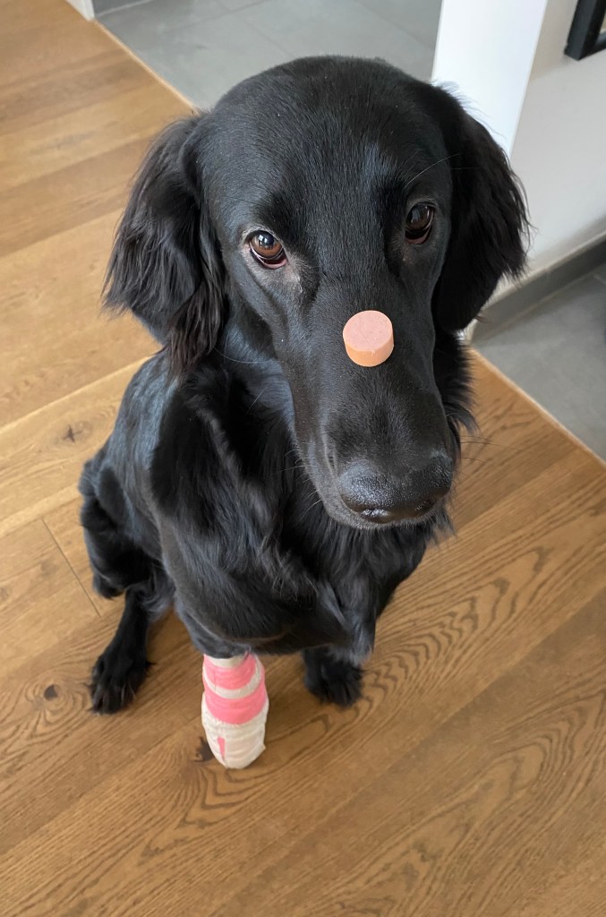 Immerhin habe ich einen Plan B: Wenn der Verband jemals abkommen und ich wieder normal laufen kann, mache ich hier die Düse und werde Zirkushund. Dann springe ich durch Feuerreifen und Frauchen kann ja mal probieren, dem Kater was beizubringen.